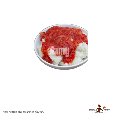 Maize meal pap cooked served with a piece of wors, steak and chakalaka on the side.